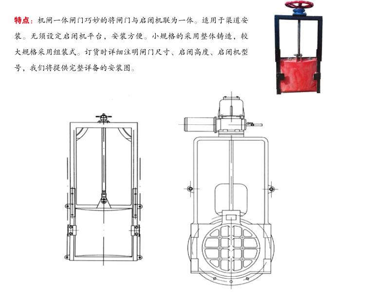 機(jī)閘一體式閘門(mén) 鑄鐵閘門(mén)是一種小型平板閘門(mén),廣泛使用于取水輸水、市政建設(shè),給水排水、農(nóng)田灌溉等工程中,通常設(shè)置在渠道、涵管的進(jìn)水口,用作工作閘門(mén)調(diào)節(jié)流量、控制水位,或用作檢修閘門(mén)關(guān)閉孔口擋水。